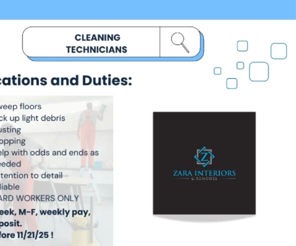 Zara Interiors & Remodel is hiring four Office Cleaning Technicians.